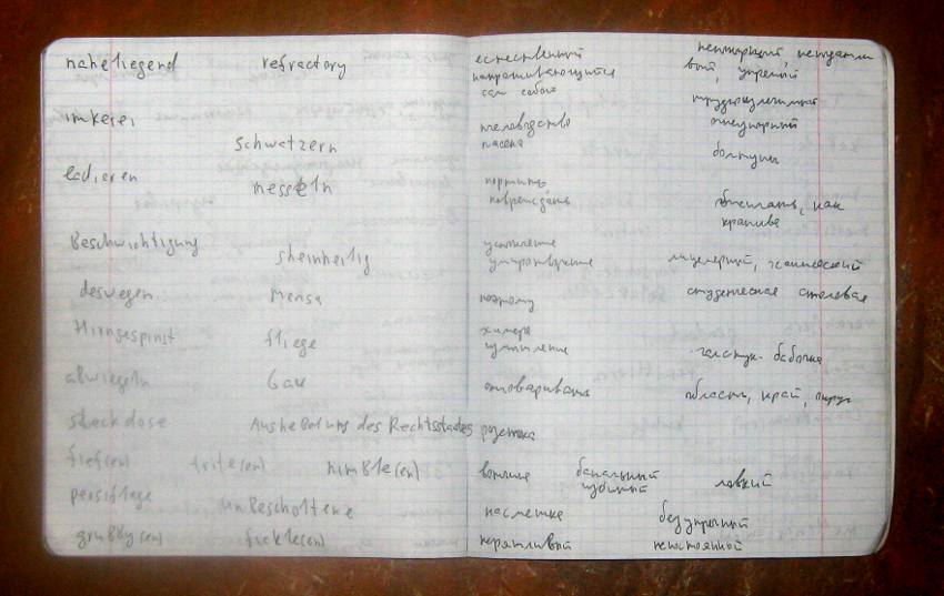 Преимущество такой записи в том, что можно прикрыть одну половину бумажкой, вспоминать слова из другой половины и тут же проверять себя. Английский и немецкий я учил, закрывая только правую половину листа, то есть перевод, поскольку научиться говорить мне было не так интересно, как научиться читать и слушать. Повторял слова я обычно раз в день, те из них, которые находились на последней и предпоследней странице, то есть записаные недавно. Тетрадь постепенно заполнялась, слов в ней становилось всё больше, и я стал иногда повторять и более ранние страницы. Впрочем, систему упорядоченного повторения ранее записаных страниц я не применял, пока не стал учить третий язык. С ним я стал ещё и повторять "справа налево", то есть вспоминать слово по переводу. При этом на каждое слово тратится всего лишь несколько секунд. Даже если суммировать время, затрачиваемое на слово при повторении один - два раза в день в течение нескольких дней, всё равно получается немного.